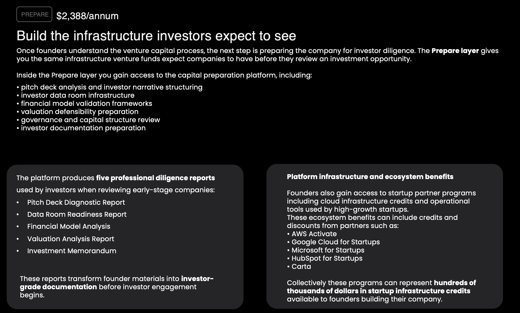The MoonshotNX Prepare layer gives founders the infrastructure required to build an investor-ready company before engaging with venture capital investors. Founders gain access to investor documentation frameworks, financial model validation tools, governance preparation systems, and investor data room infrastructure used during venture capital due diligence.
