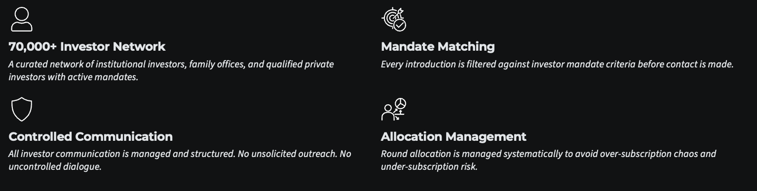 The 70,000+ global investor network is filtered by mandate before any introduction is made. Investors in the Room have expressed interest in specific sectors, stages, geographies, and deal structures. Introductions are made on that basis, not on proximity or volume.