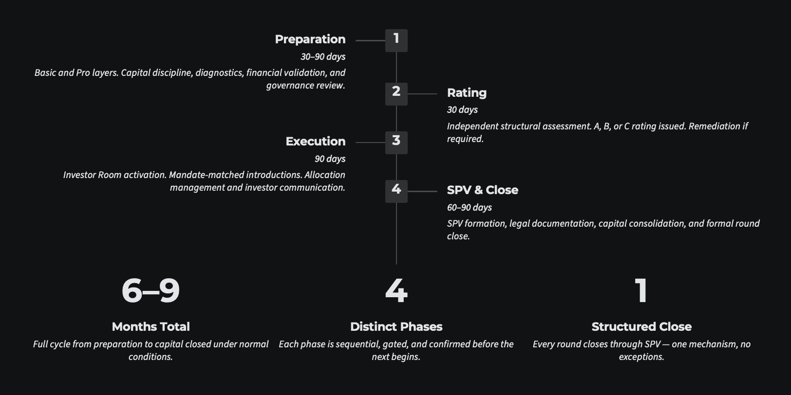 No company is introduced to investors without a rating that supports that introduction. This requirement is being implemented across participating investors globally. The Rating transforms capital access from discretionary outreach into a managed system replacing informal screening with independent structural assessment. This framework will become standard screening protocol across participating investors within 6–9 months.